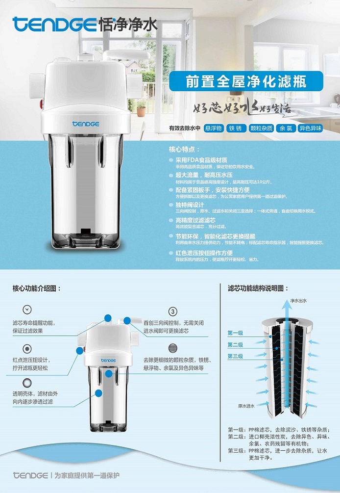 恬凈前置全屋凈化濾瓶TQ-P2能有效去除水中的懸浮物、鐵銹、顆粒雜質(zhì)、余氯、異色異味,它采用FDA食品級(jí)材質(zhì),高精度過濾濾芯,體積小巧,安裝方便。恬凈前置全屋凈化濾瓶TQ-P2能承受高水壓,流量超大,智能濾芯提醒功能,節(jié)能環(huán)保。