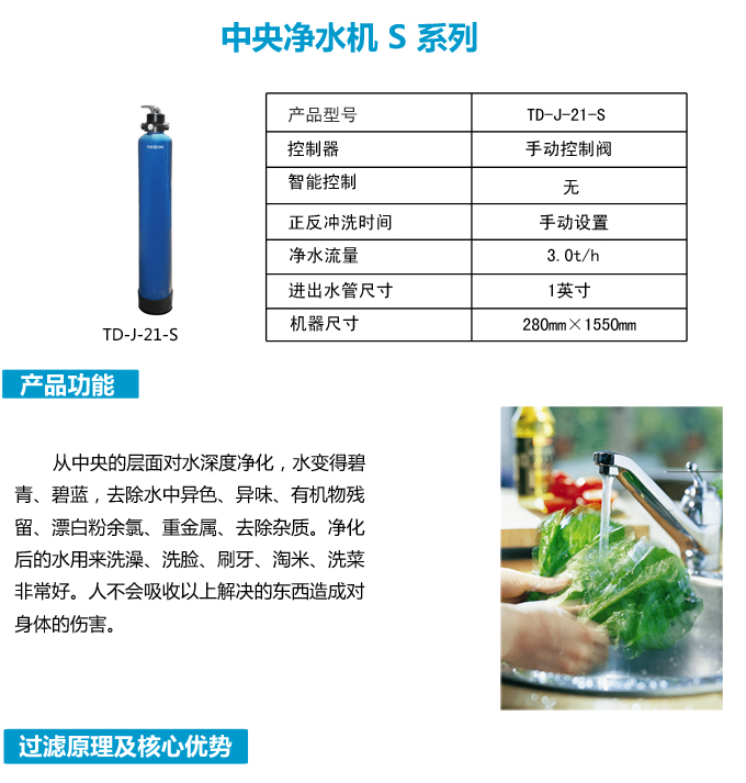 手動全屋中央凈水機有效去除水中的異色、異味;進一步濾除水中微小雜質(zhì)、膠狀體;去除水中的漂白粉余氯、農(nóng)藥、重金屬;保留對人體有益的礦物質(zhì)。使水變得碧清、碧藍,去除對人體有害的物質(zhì)。