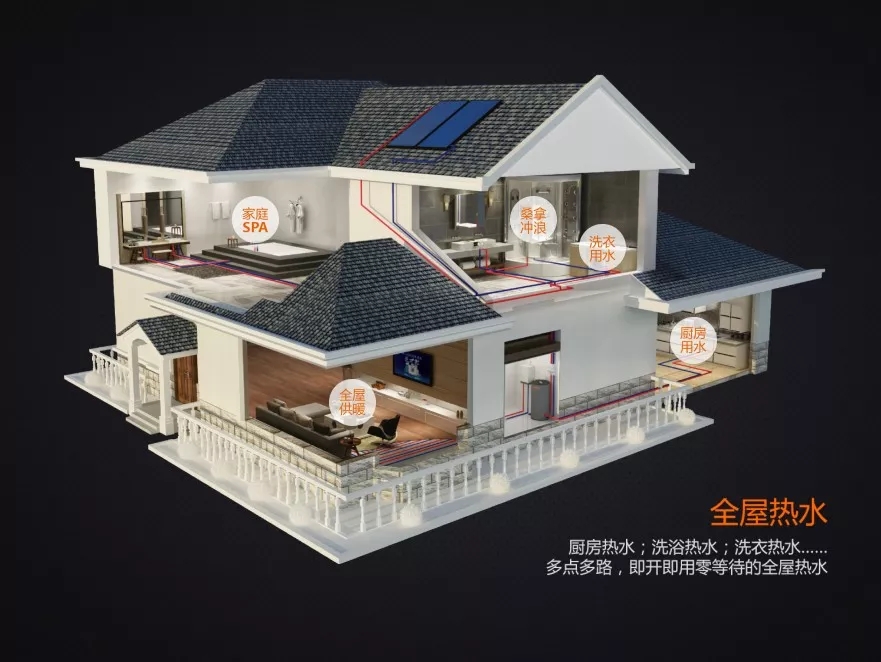 全屋熱水系統(tǒng)四:系統(tǒng)爐+熱泵一體機系統(tǒng)。此方案除了能夠供多個出水點持續(xù)出熱水外,系統(tǒng)節(jié)能性非常優(yōu)越。